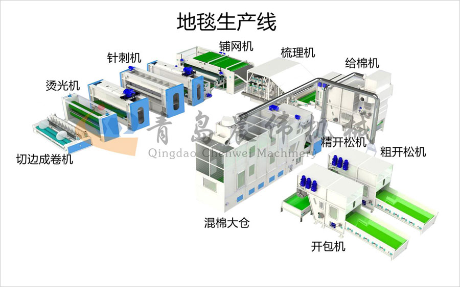 開(kāi)包機-開(kāi)松機-振動(dòng)給棉機-梳理機-鋪網(wǎng)機-針刺機-切邊成卷機
