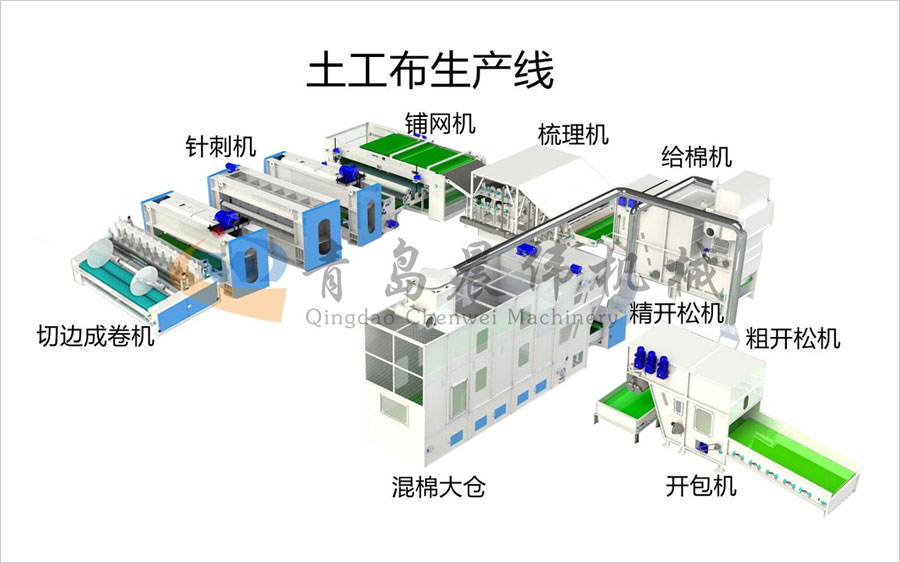 開(kāi)包機-開(kāi)松機-振動(dòng)給棉機-梳理機-鋪網(wǎng)機-針刺機-切邊成卷機